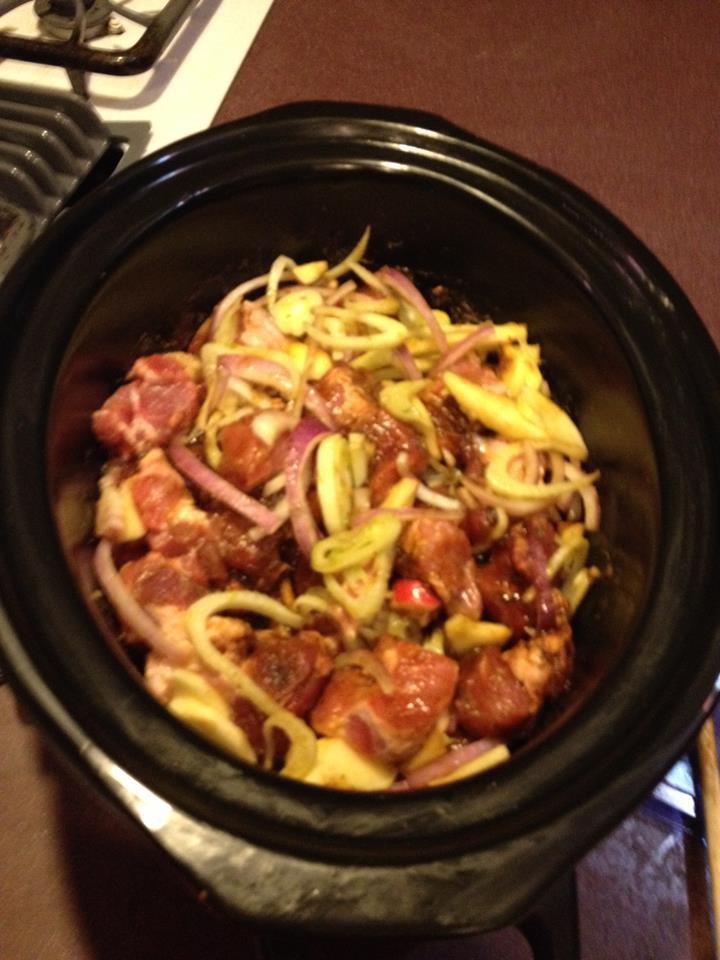 2. Season the pork with sea salt and fresh cracked black pepper. Add to the slow cooker and stir to combine with the vegetables and apples.